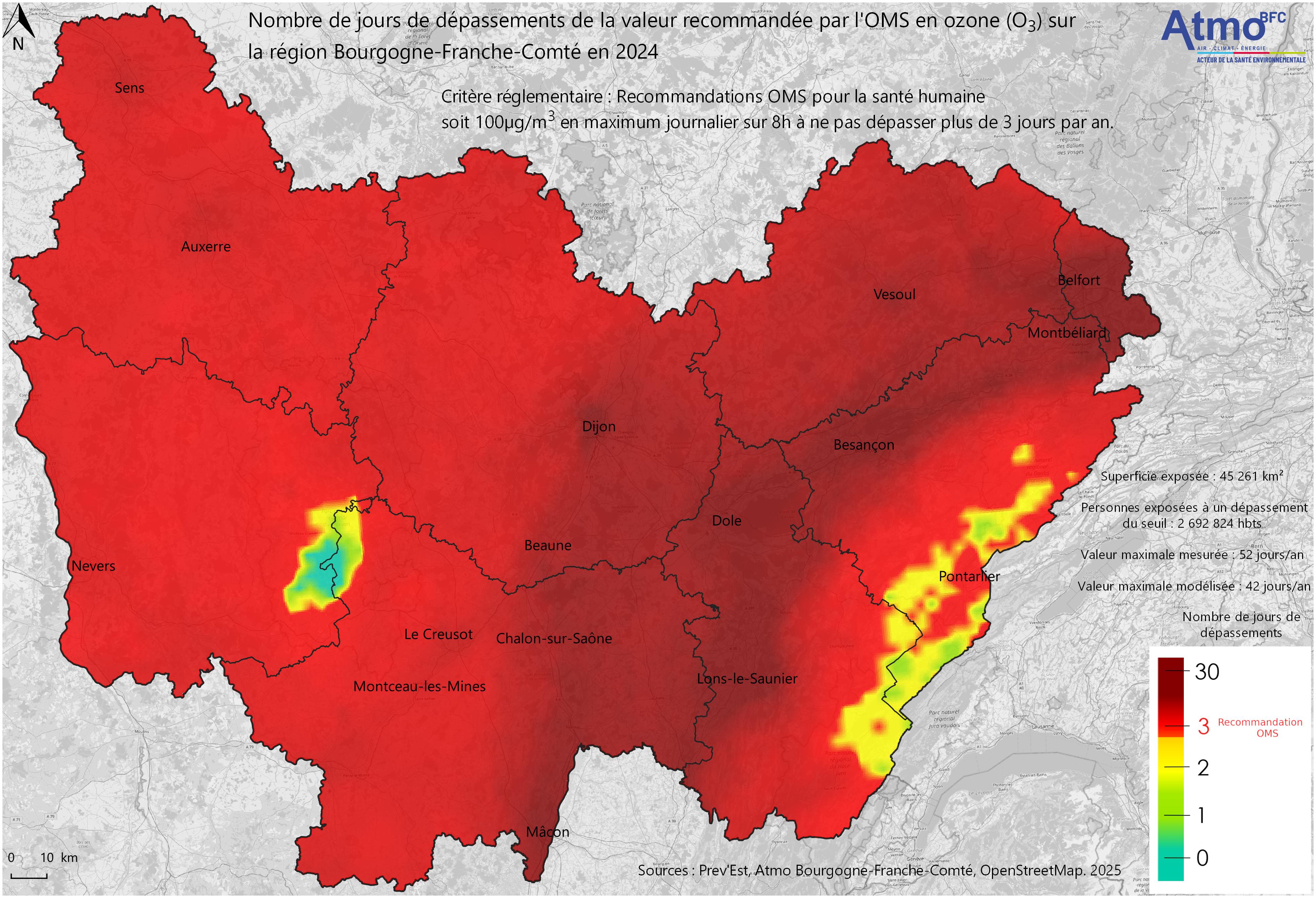 Nombre de jours de dépassements de la valeur recommandée par l'OMS en ozone (O3) sur la région BFC en 2024.
