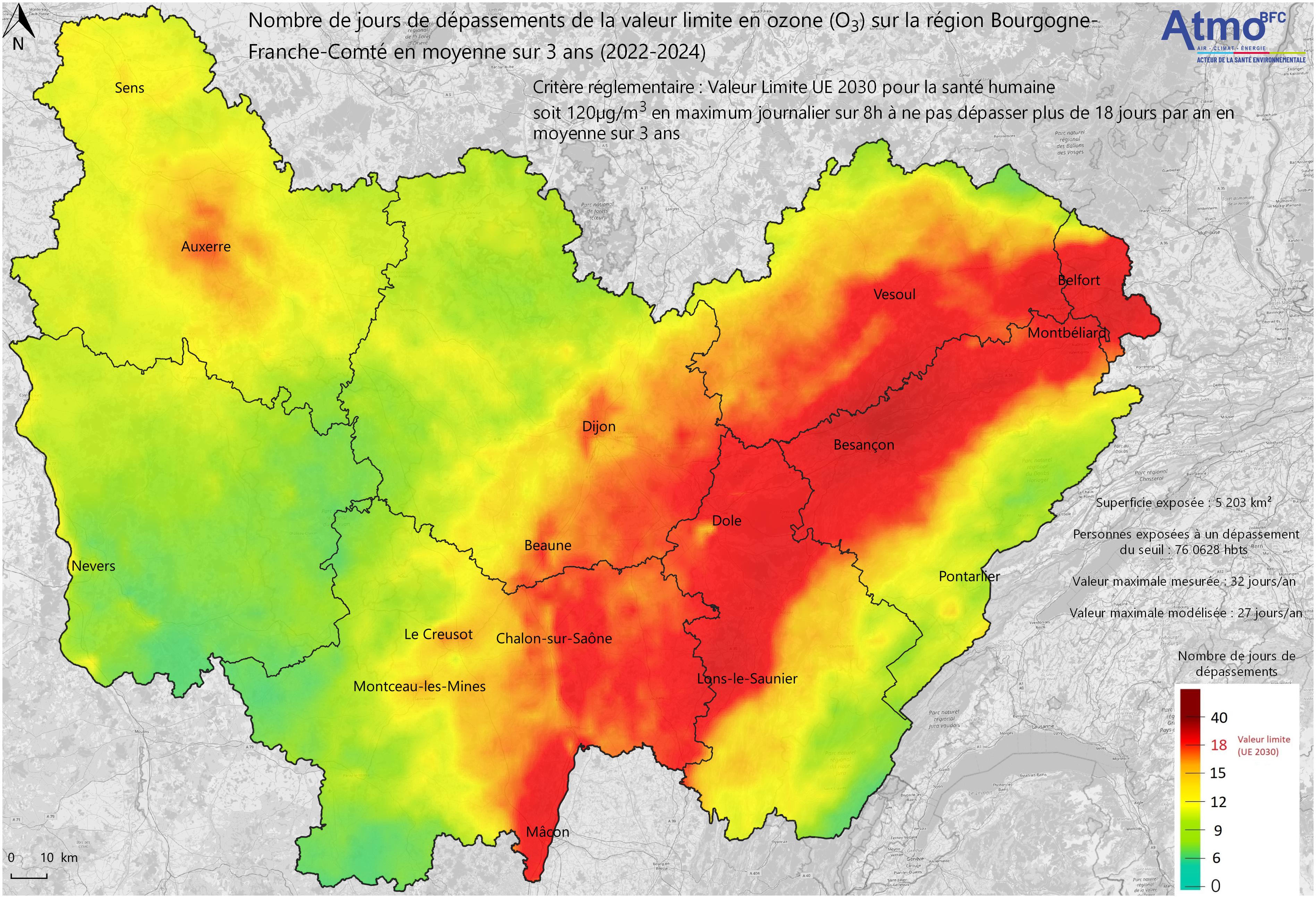 Nombre de jours de dépassements de la valeur cible en ozone (O3) sur la région BFC sur 3 ans (2022-2024).