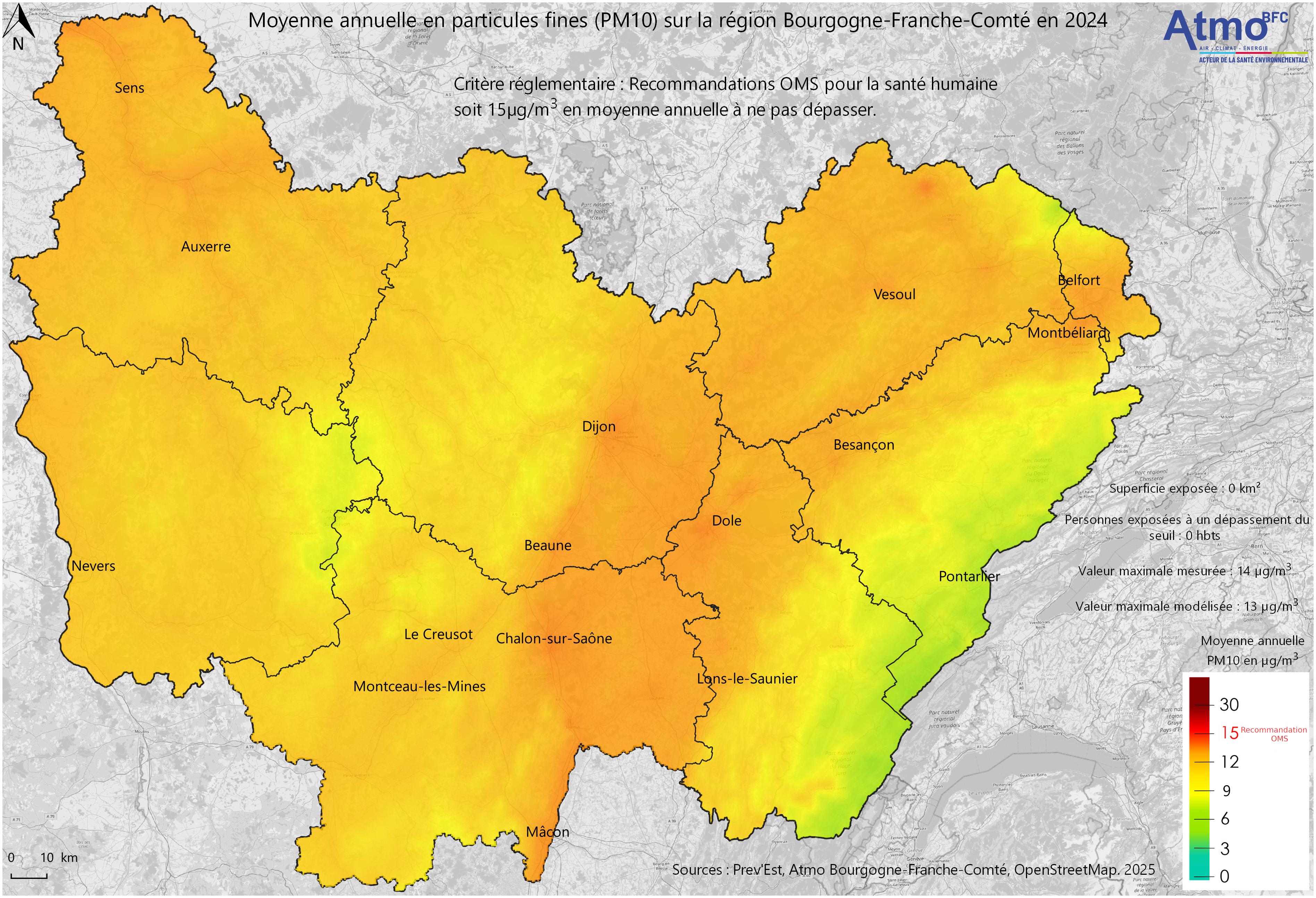 Moyenne annuelle en dioxyde d'azote (NO2) sur la région BFC en 2024.Critère réglementaire : valeur guide Organisation Mondiale de la Santé (OMS) pour la santé humaine.
