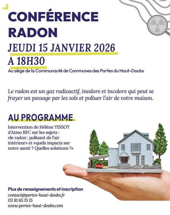 Dans le cadre de la 2ème campagne de mesurage du radon aux Portes du Haut-Doubs durant l’hiver 2025-2026, une réunion d'information sera animée par Hélène TISSOT, Responsable Qualité de l’Air intérieur chez  ATMO BFC.