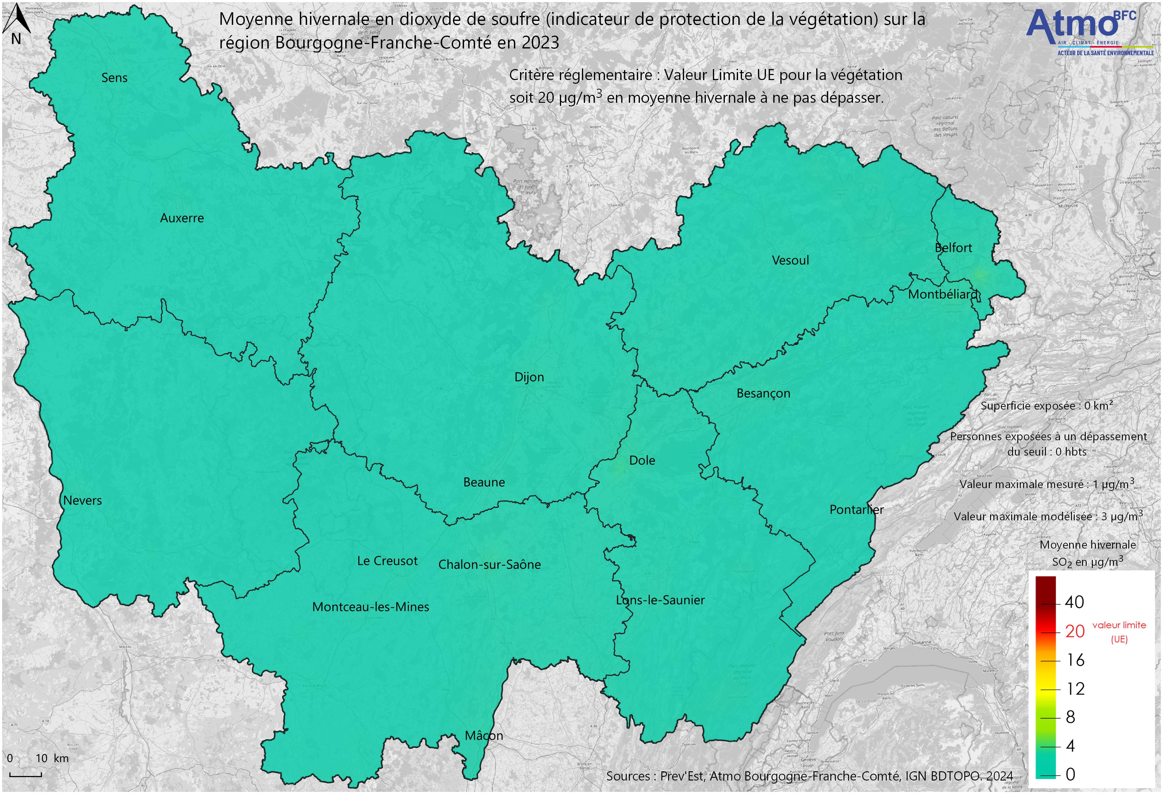 Moyenne hivernale en dioxyde de soufre (SO2) sur la région BFC en 2023.