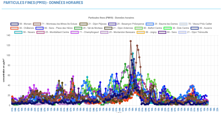 Le réseau de station de surveillance d'Atmo BFC a observé une forte hausse des concentrations en particules PM10 dans l'après-midi du vendredi 14/11.