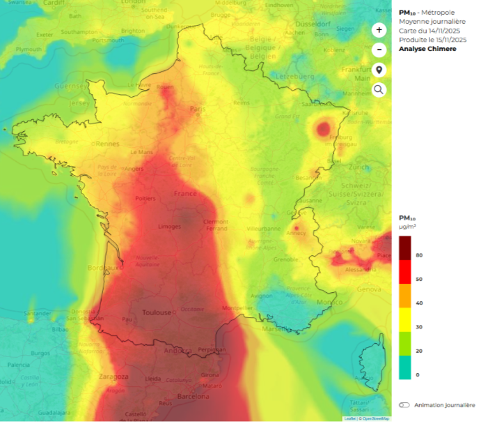 Dans la nuit du 14 au 15 novembre, des passages pluvieux intenses ont rapidement permis d'abaisser les concentrations en particules fines sur l'ensemble du pays.