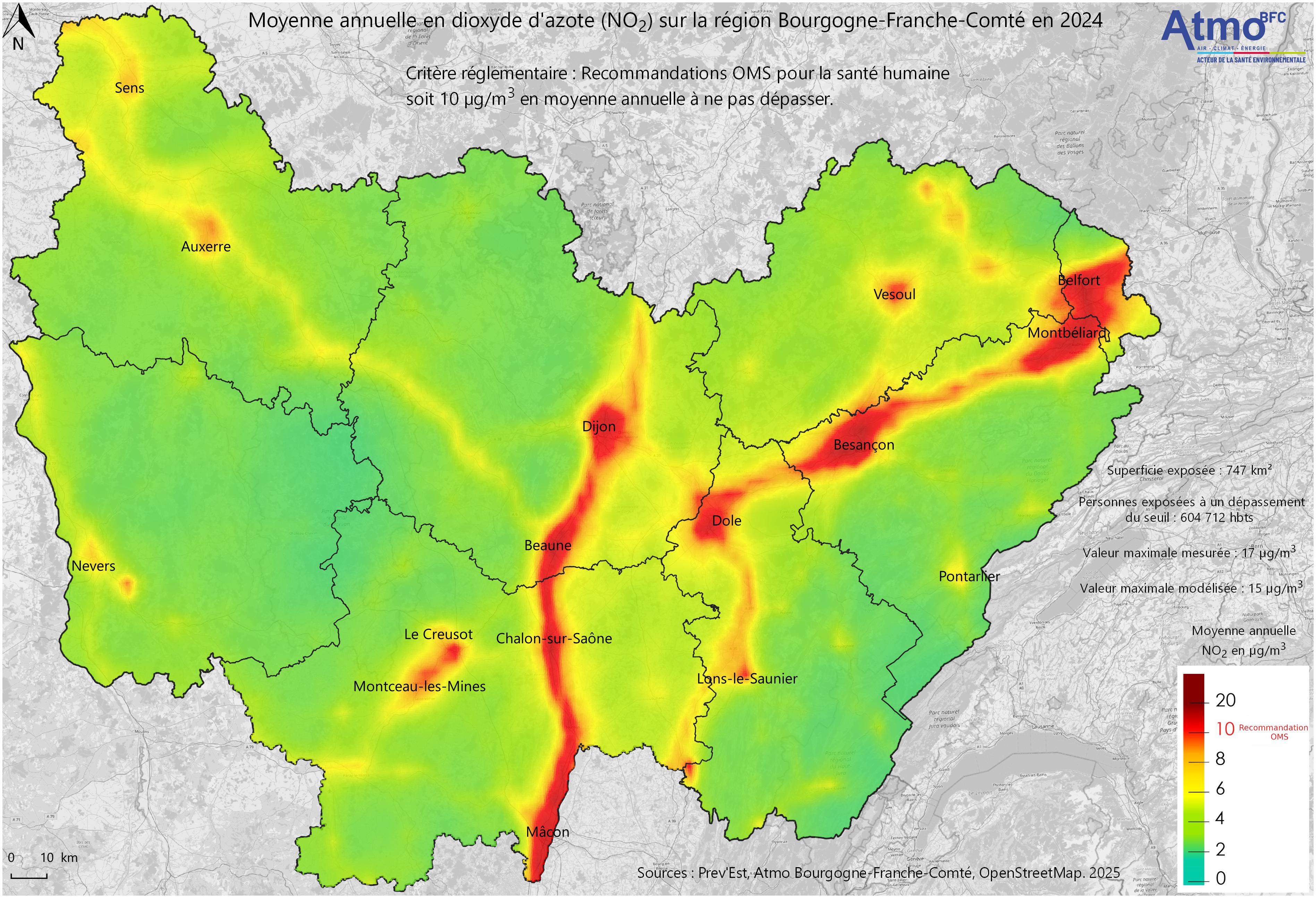 Moyenne annuelle en dioxyde d'azote (NO2) sur la région BFC en 2024.