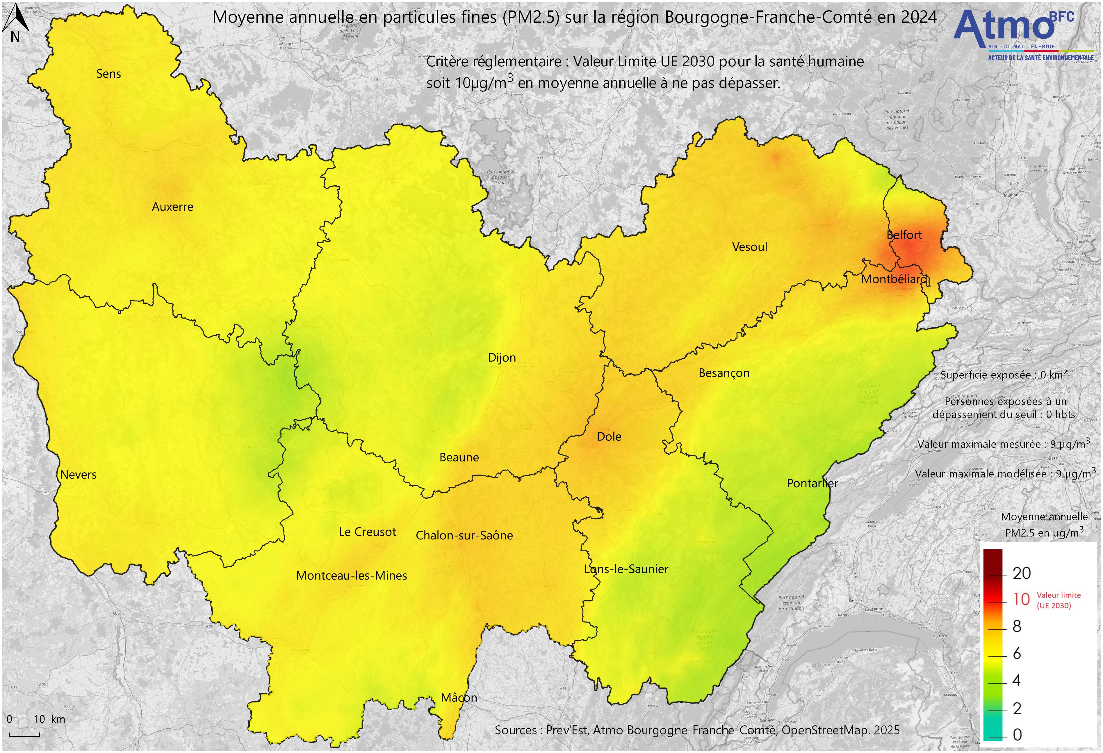 Moyenne annuelle en particules fines PM2,5 sur la région BFC en 2024.Critère réglementaire : valeur limite Union Européenne (UE 2030) pour la santé humaine.